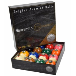 Krogle za biljard Aramith Tournament Pro Cup TV, premera 57,2mm, so najboljše krogle podjetja Saluc. Z najnovejšo tehnologijo Duramith™ te krogle postavljajo nove standarde kakovosti in vzdržljivosti. Napredna molekularna struktura dramatično podaljša življenjsko dobo krogel, hkrati pa zmanjša obrabo biljardnega platna. Materialna sestava krogel Tournament omogoča osemkrat daljšo življenjsko dobo od krogel iz poliestra ali fenolnih smol. V domači uporabi lahko krogle Tournament zlahka zdržijo do 40 let. Krogle Aramith Tournament so logična izbira tako za trgovce kot za igralce.