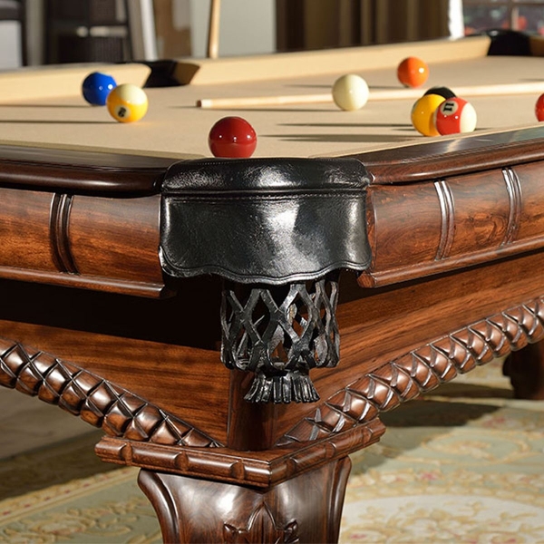 Visokokakovostni, ročno izdelani in elegantno ujemajoči se črni žepi iz pravega usnja dopolnjujejo edinstven videz biljardne mize.
