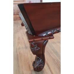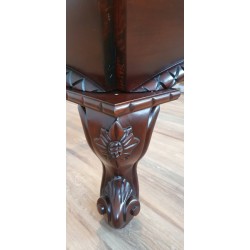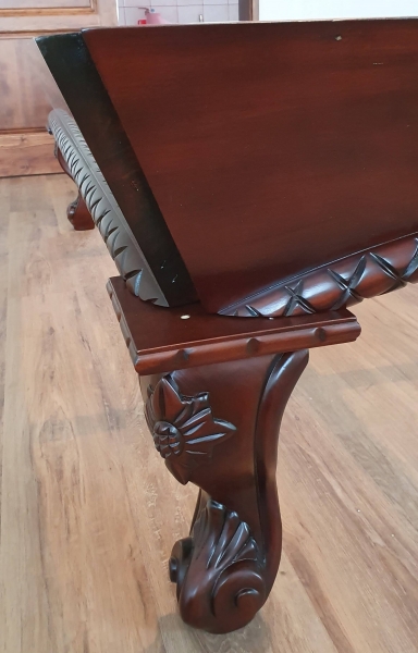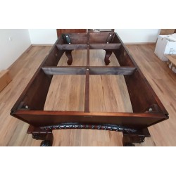 Ročno obdelan masivni,evropski, bukov les je pobarvan v starinski izgled temne mahagonijeve barve in okrašen z zapletenimi rezbarijami.