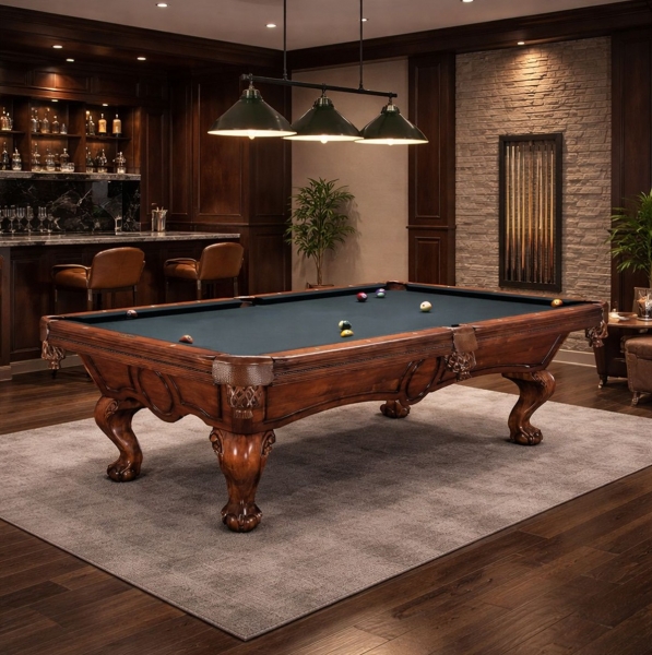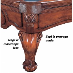 Ekstravagantna oblika podnožja in čudovite noge iz masivnega lesa, okrašene z izvrstnimi, ročno izdelanimi okraski, bodo očarale vsakega igralca. Ta model ni le vizualno osupljiv, ampak je zaradi svoje prefinjene konstrukcije tudi izjemno robusten in stabilen. Še en pomemben detajl Golden West mize za biljard so čudoviti, ročno izdelani žepi iz pravega usnja v ujemajoči se antično rjavi barvi. Žepi poudarjajo eleganco te vrhunsko izdelane in izjemno trpežne biljardne mize.