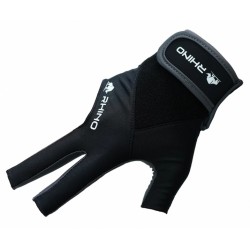 Visoko kvalitetna rokavica za biljard Rhino Premium, izdelana iz 100% Lycra, za nošenje na Desni roki, velikost M (Medium) je 3 prstna rokavica z odprtimi prsti in velcro sprijemalnim trakom za zapenjanje, na vrhni strani zapestja. Sestava: 100% Lycra (gladko, elastično in udobno pletivo). Velikost: M (Medium) Barva: Črna