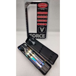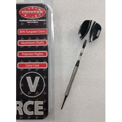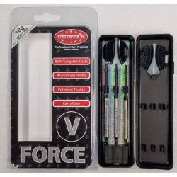 Pikado puščice V-Force, proizvajalca Unistar, teže 18gr, z 80% vsebnostjo Volframa (Tungsten) v uteži. Komplet Pikado puščic V-Force je namenjen za elektronske tarče za pikado in vsebuje 3 pikado puščice, ki imajo Pentathlon 150 mikronska peresa standardne diamantne oblike ter aluminijaste trupe 45mm dolžine (medium). Komplet ima priloženo črno plastično torbico za shranjevanje.