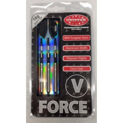Unistar V-Force puščice za pikado, teže 18gr, z valovito utežjo dolžine 50mm iz 80% Volframa, so opremljene s trupi iz aluminija medium dolžine (45mm) in peresi Pentathlon, standardne diamantne oblike (diamond shape).