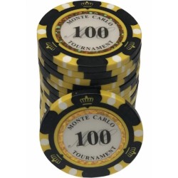 25 glinenih poker žetonov "Monte Carlo" z denominacijo 100, črno-rumene barve ter teže 13,5gr.